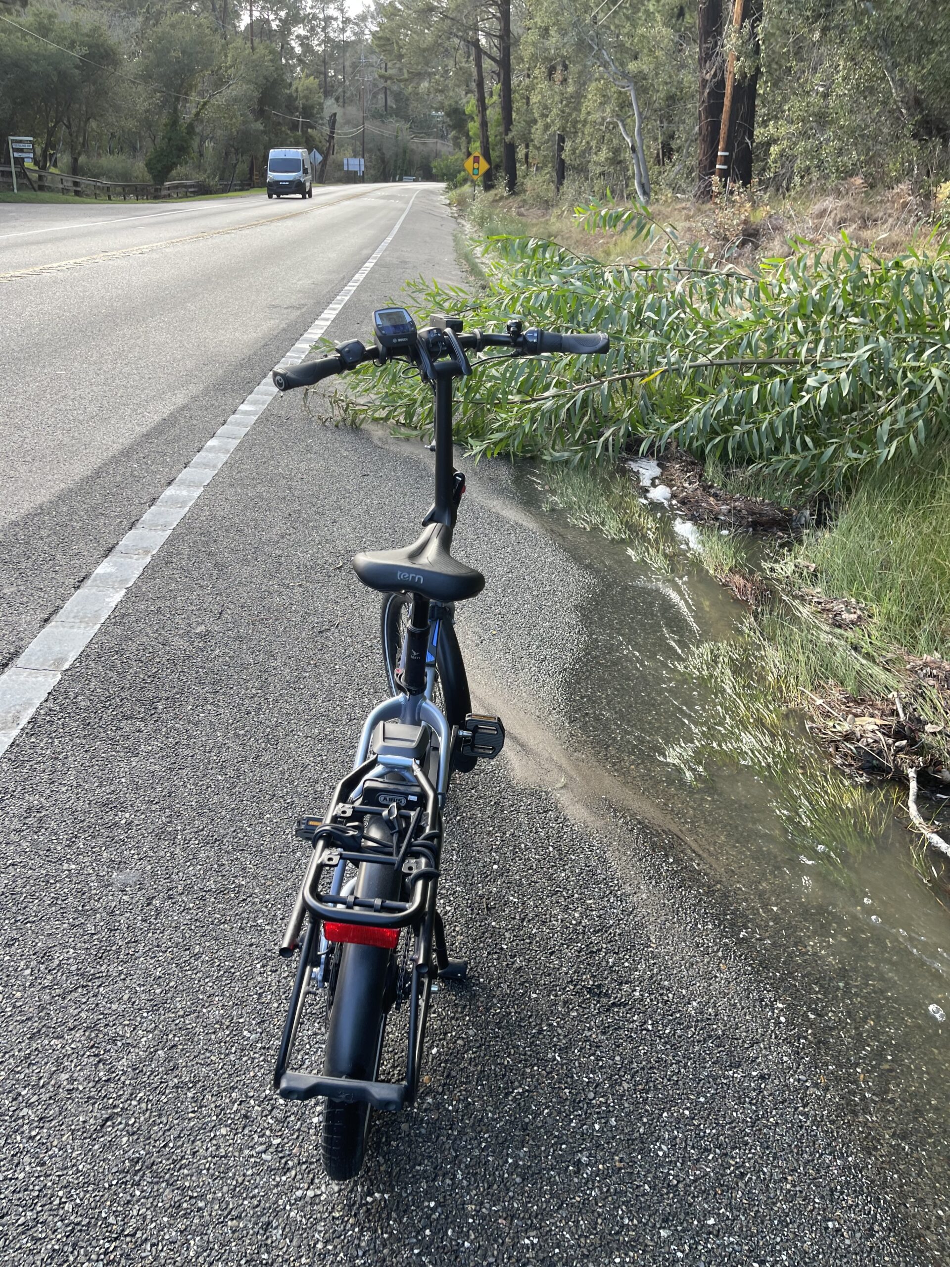 Below: On 4 January 2026, a small tree has blocked the shoulder of westbound CA SR 68, making it necessary to either bike in the motor vehicle travel lane of this high-speed, typically busy highway or hop off and walk the bicycle around the tree. We reported this to CalTrans that day. https://csr.dot.ca.gov/