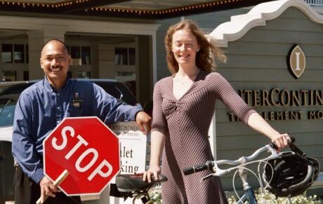 Below, the hostess at the Sandbar and Grill on HHT-unanimous Wharf II, Monterey encourages customers to bike on out!