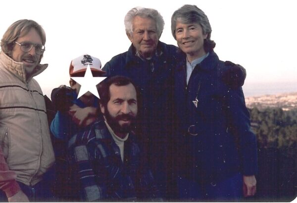 Below: The late poet and author Josh Jossi (at far left) and the late conservationist Arthur Nelson (grey-haired gentleman), with friends on Jacks Peak Road, at a popular Monterey Bay vista spot, November 1984.